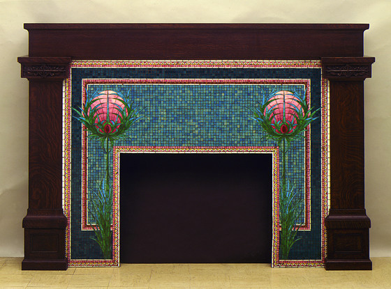 Oak, glass mosaic, and enamel