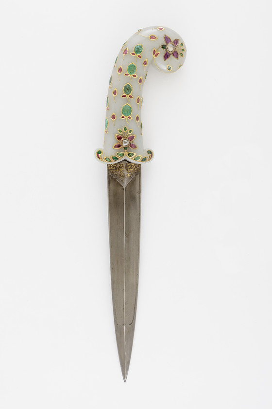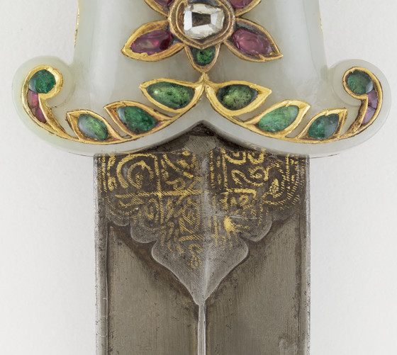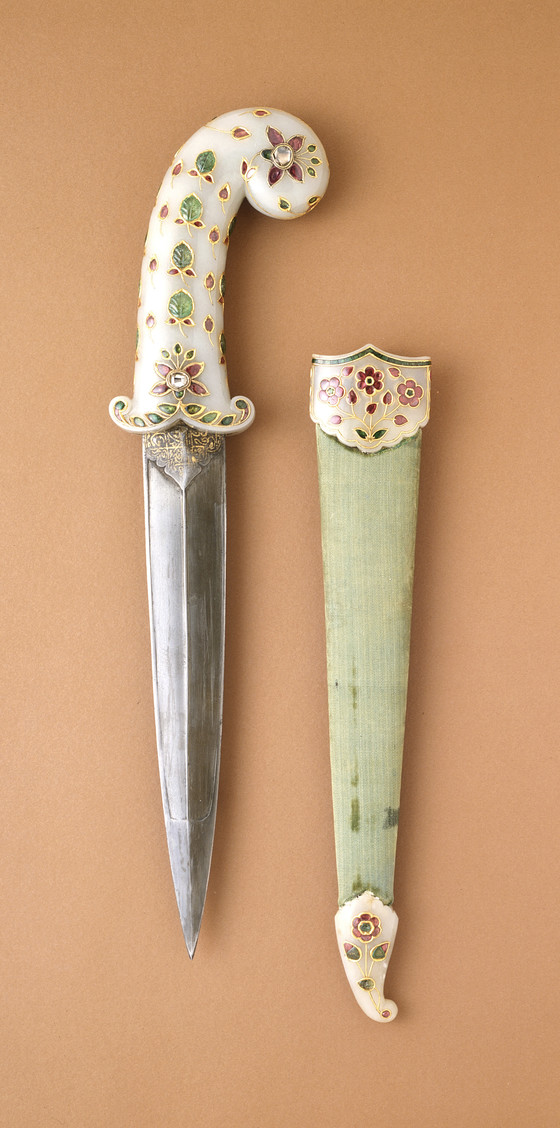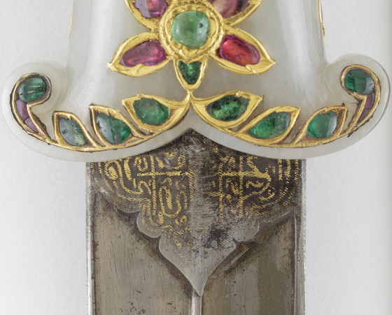 White nephrite jade hilt and sheath fittings inlaid with foil-backed rubies, emeralds, and diamonds set in gold; steel blade; velvet covered wooden sheath