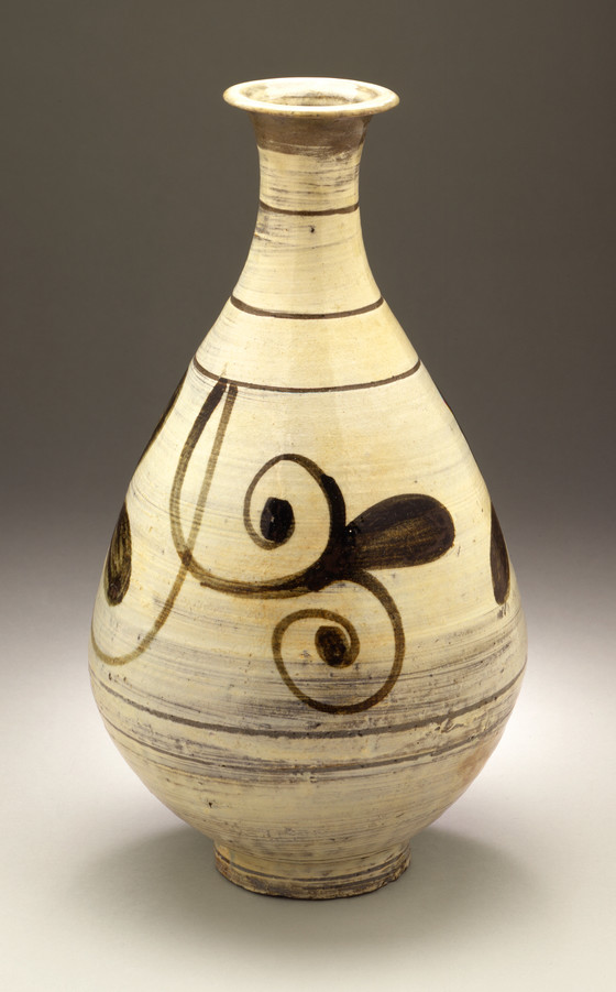 Buncheong ware; Wheel-thrown stoneware with incised slip and brown painted decoration and pale green glaze