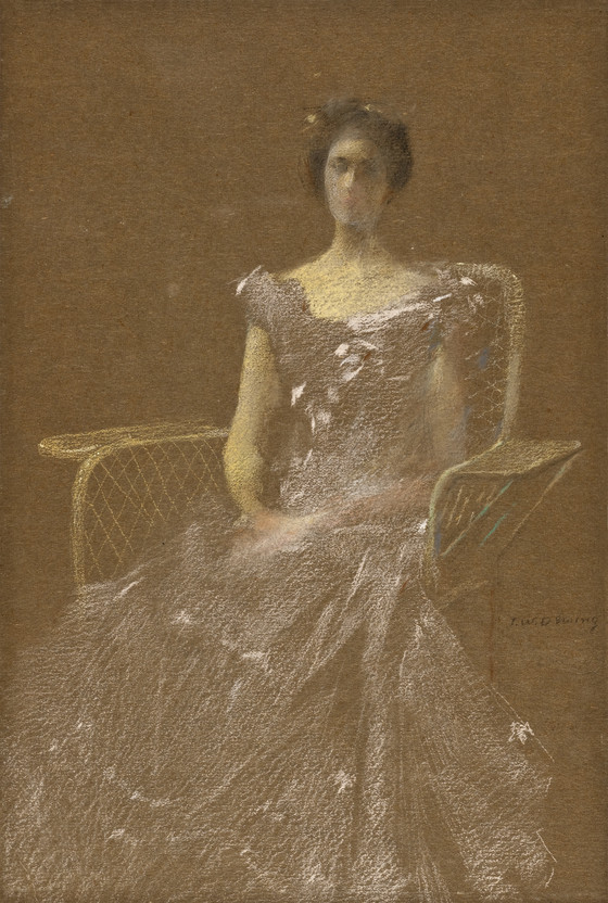 In 1890 Thomas Dewing, one of America's premier figure painters, adopted pastel, and within a short time became one of the leading proponents in the field. The medium was a perfect match for his subject matter and aesthetics. Dewing specialized in elegant and poetic interpretations of upper class young women, usually enveloped in a haze of atmosphere or mist. Whether set in a garden or a room, his lovely women seem quite unreal, their beautiful faces idealized into aristocratic portraits and their sweeping gowns transformed into diaphanous gauze. All appears dreamlike. Pastels allowed Dewing to convey an even greater sense of insubstantiality and softness than did his oils. The young woman sitting in the rattan chair definitely exists as her upright posture and strong shoulders indicate, but the shimmering gown that swaths her body seems to almost disappear. "Beauty for beauty's" sake became the aesthetic motto of Dewing's world.