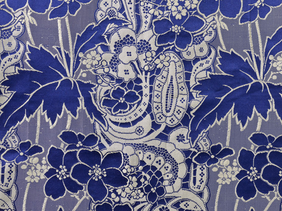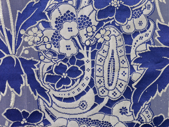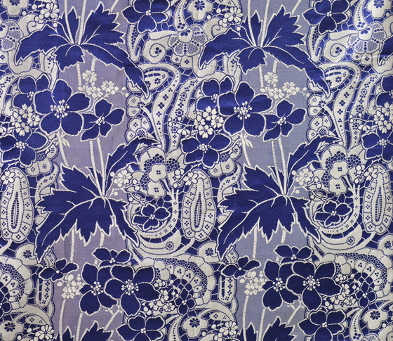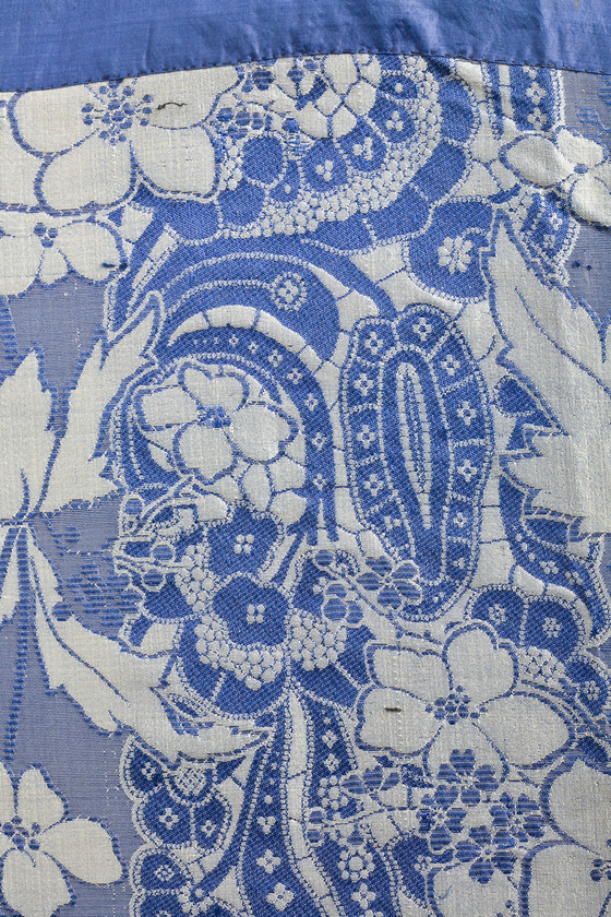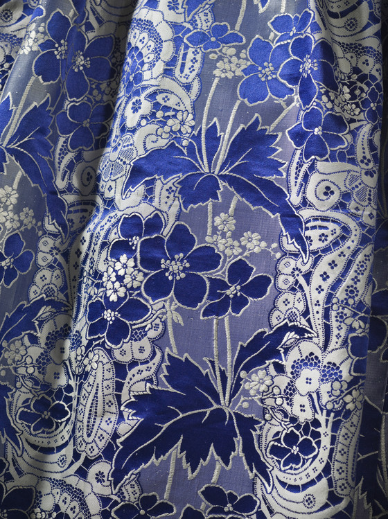 Silk plain weave with supplementary weft-float patterning, silk satin, and silk ribbon trim