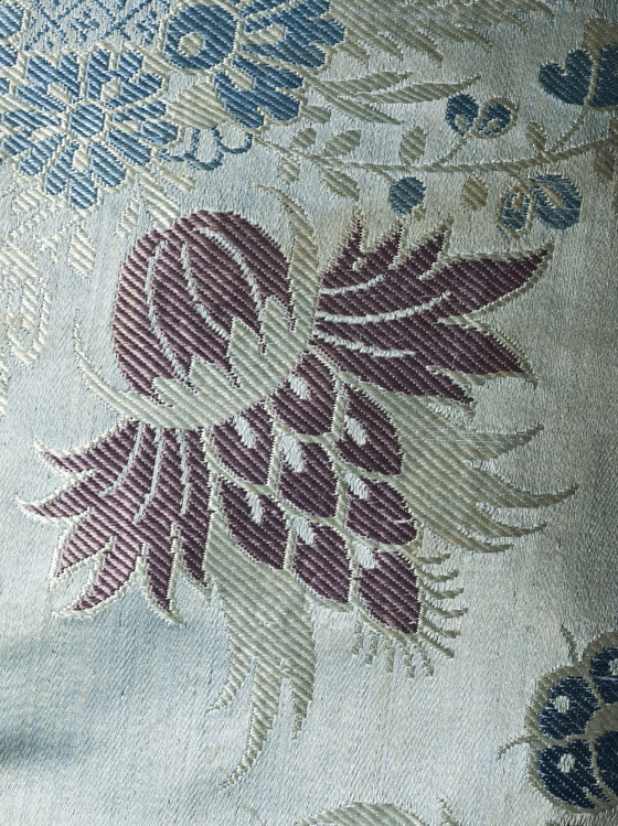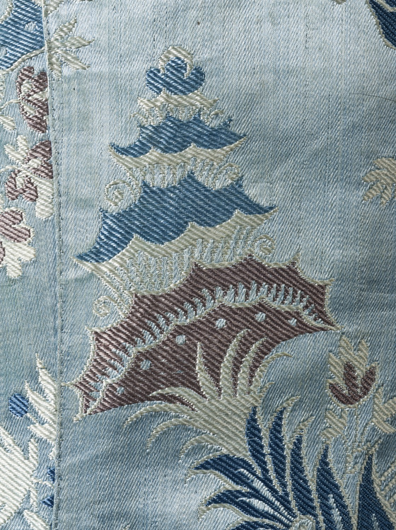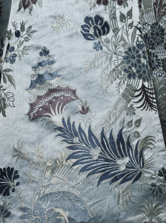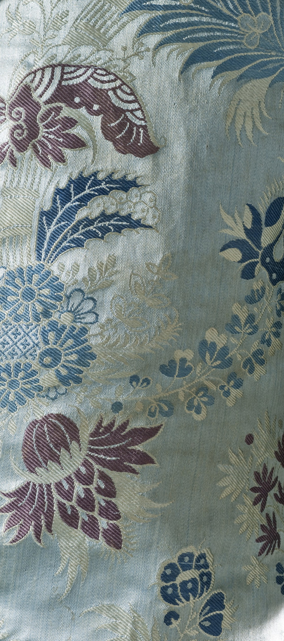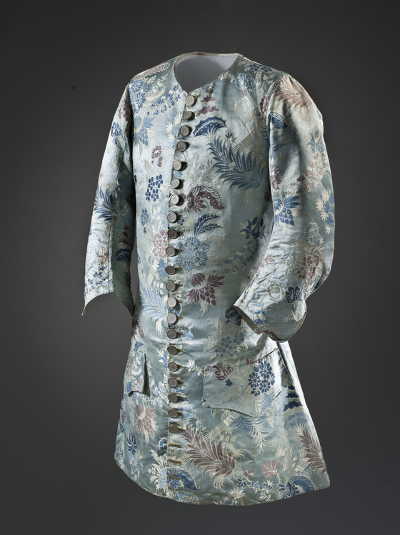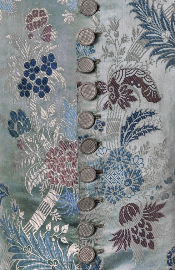 Silk satin with supplementary-weft patterning bound in twill (lampas), metal buttons