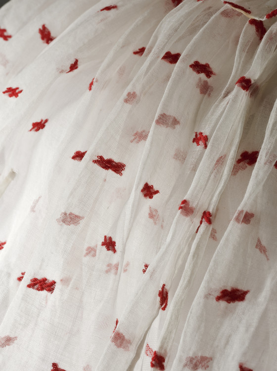 Cotton plain weave with wool supplementary patterning, silk satin ribbon, and cotton machine lace