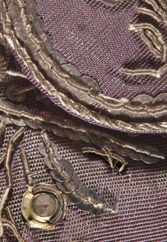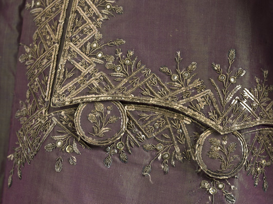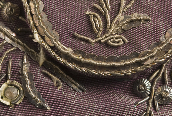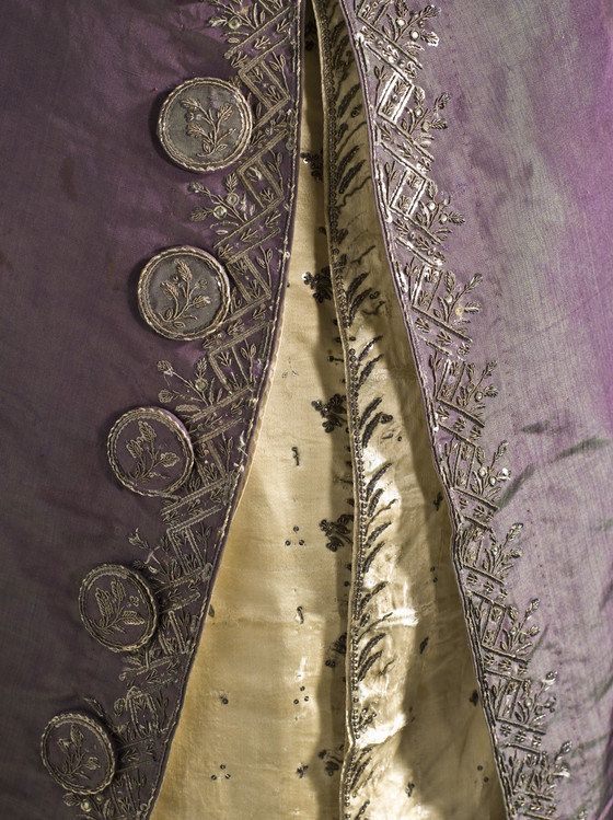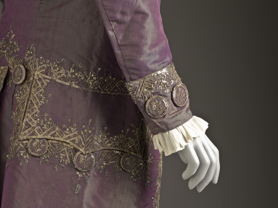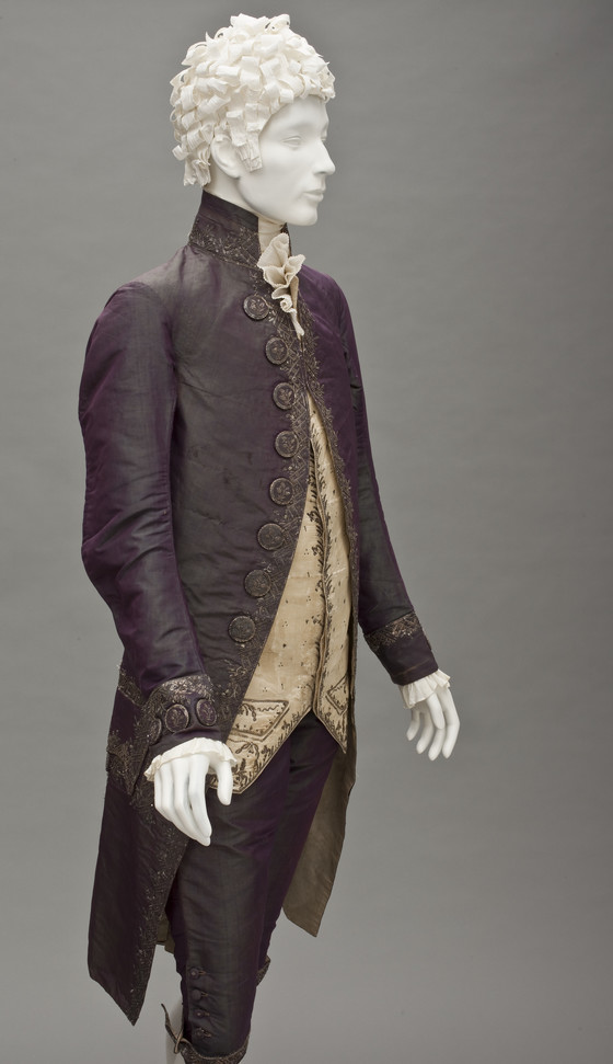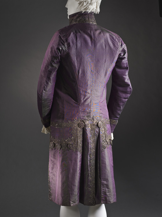 Coat and breeches: silk plain weave (shot taffeta) with sequins and metallic-thread embroidery; waistcoat: silk satin with sequins and metallic-thread embroidery