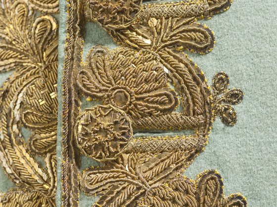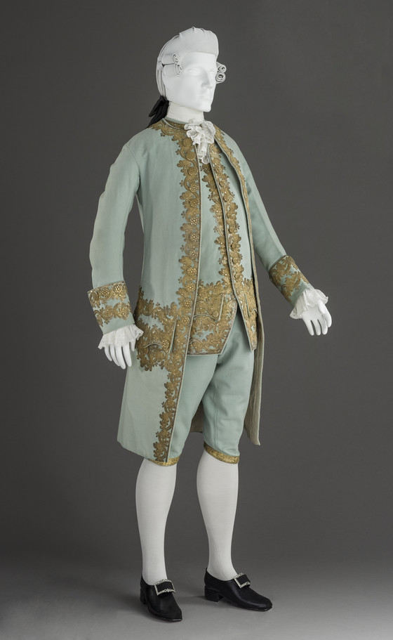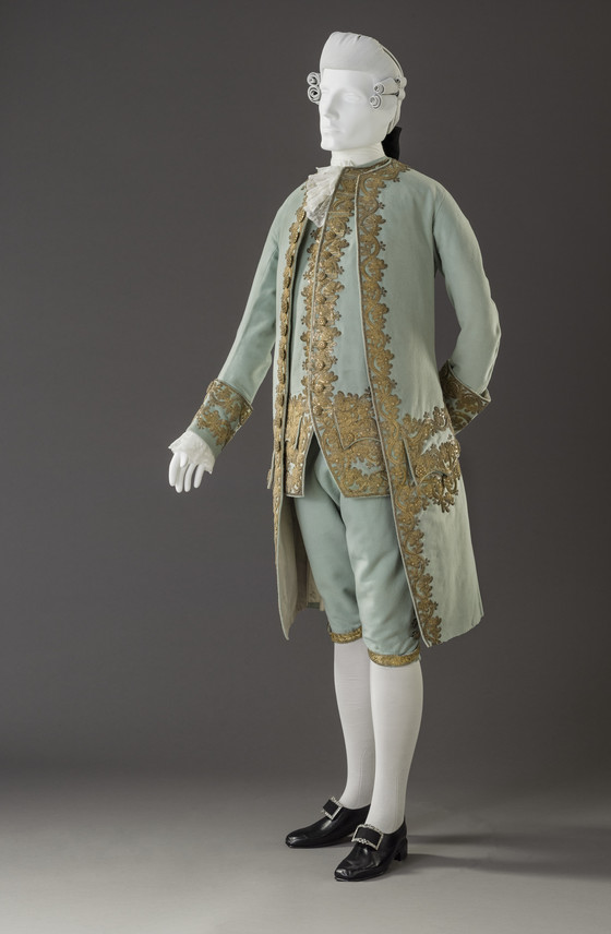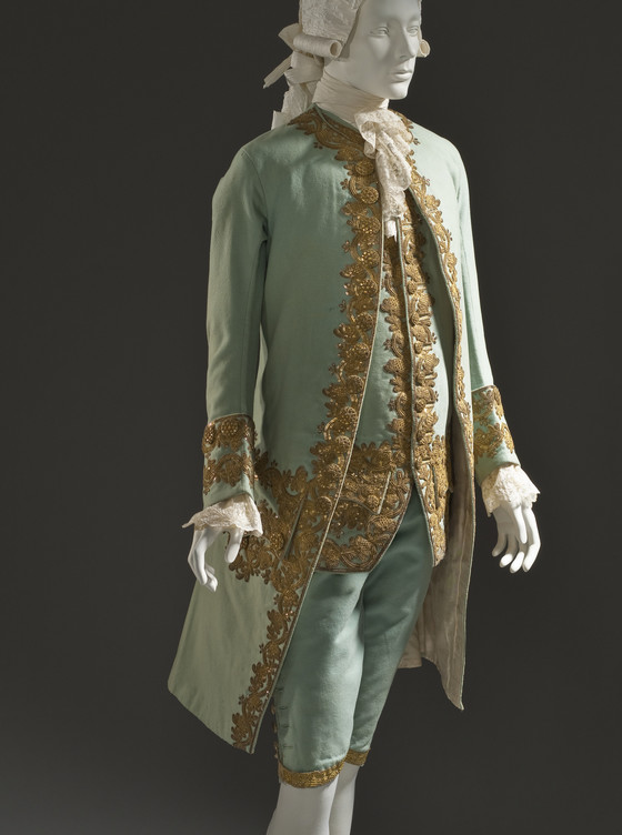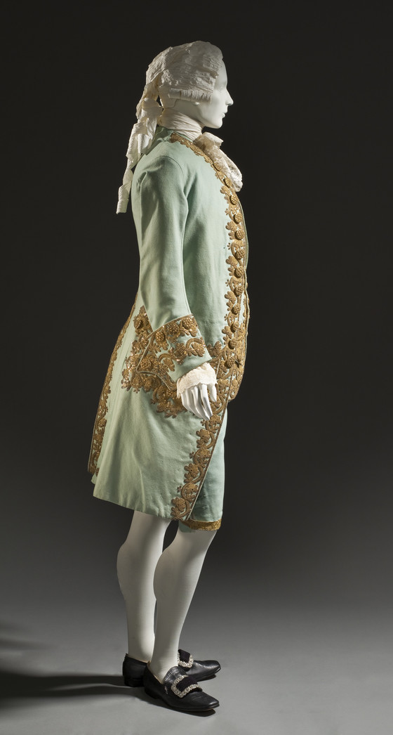Breeches: wool plain weave, full finish, with silk- and metallic-thread passementerie