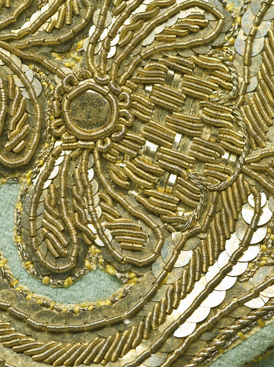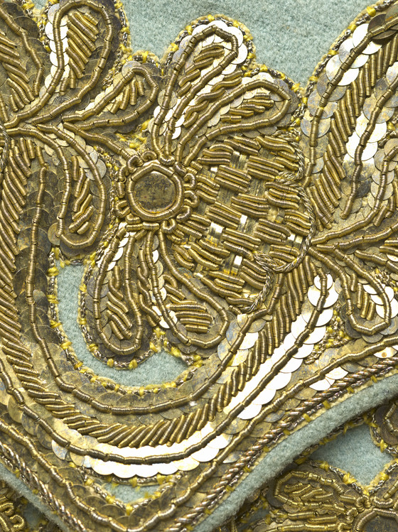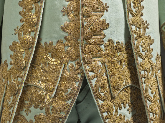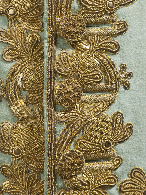 Coat and waistcoat: wool plain weave, full finish, with sequins and metallic- thread embroidered appliqués