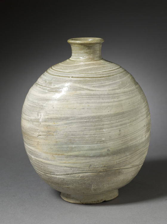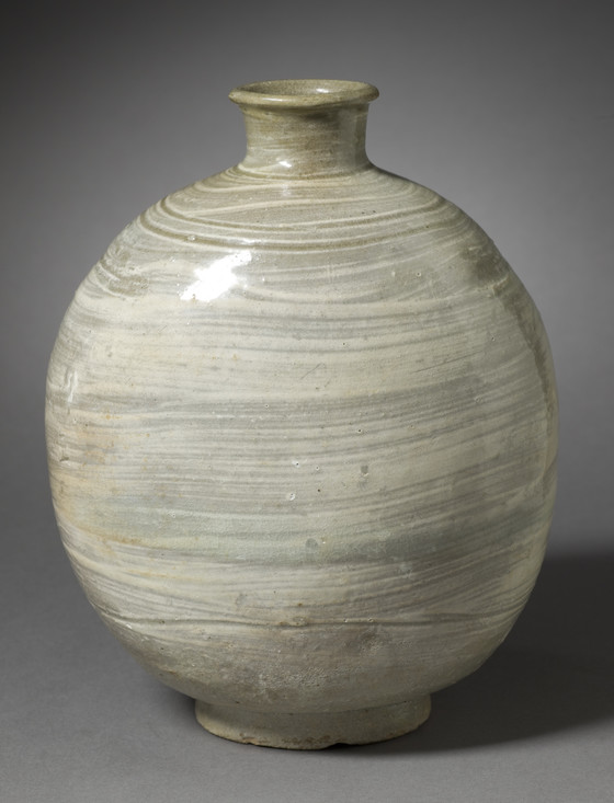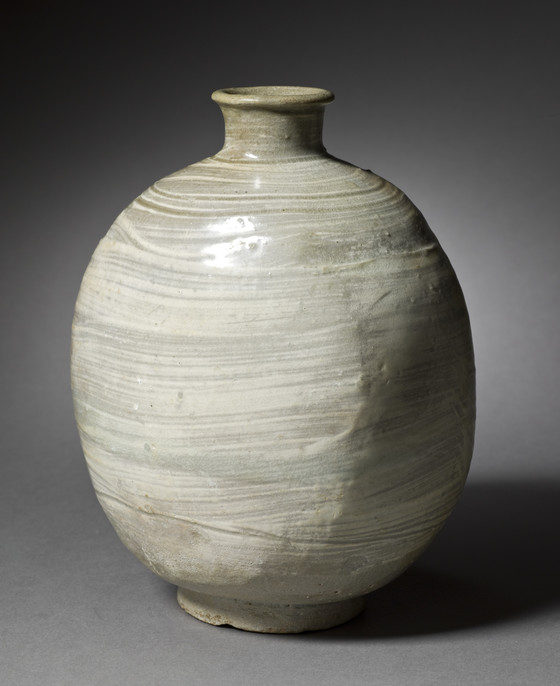 Buncheong ware; Wheel-thrown stoneware with brushed slip decoration and pale green glaze
