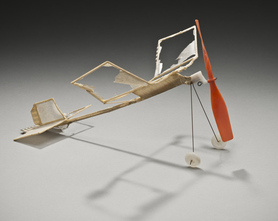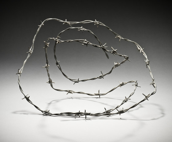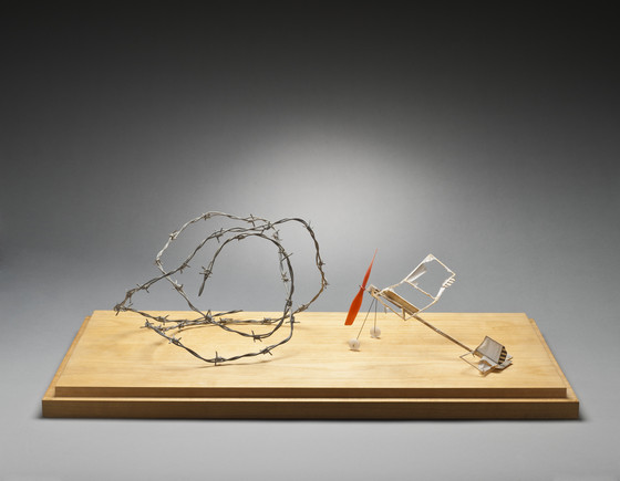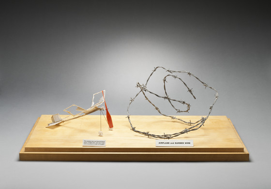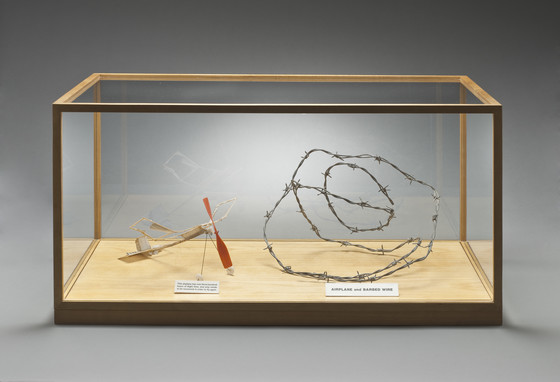 Overall: 16 x 31 x 17 in. (40.64 x 78.74 x 43.18 cm); a) Model airplane: 7 x 11 x 10 in. (17.78 x 27.94 x 25.4 cm); b) Airplane text sheet: 3 x 3 1/8 x 5/8 in. (7.62 x 7.94 x 1.59 cm); c) Barbed wire: 12 x 12 x 12 in. (30.48 x 30.48 x 30.48 cm); d) Barbed wire text sheet: 1/2 x 5 1/8 x 1/2 in. (1.27 x 13.02 x 1.27 cm); e) Glass case [base]: 1 1/16 x 31 x 17 in. (2.7 x 78.74 x 43.18 cm); e) Glass case [vitrine]: 15 x 31 x 17 in. (38.1 x 78.74 x 43.18 cm)