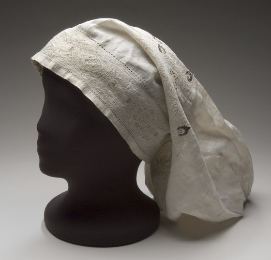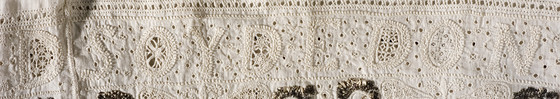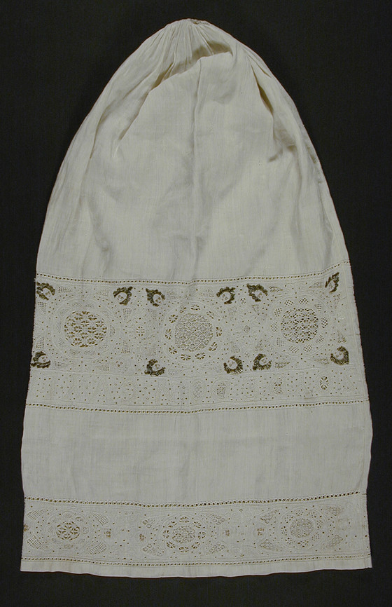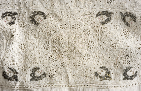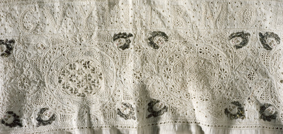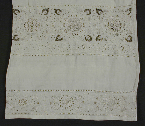 Linen plain weave with linen cutwork embroidery and metallic-thread and silk embroidery