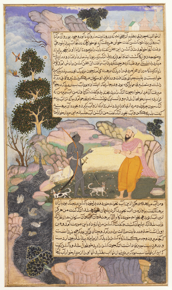 The Brahman Uttanka Meets Indra, who is Disguised as an Outcast Chandala, Folio from a Razmnama (The Book of War)