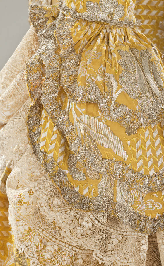 a) Robe à la Francaise center back length: 57 1/2 in. (146.05 cm); b) Petticoat center front length: 34 in. (86.36 cm)