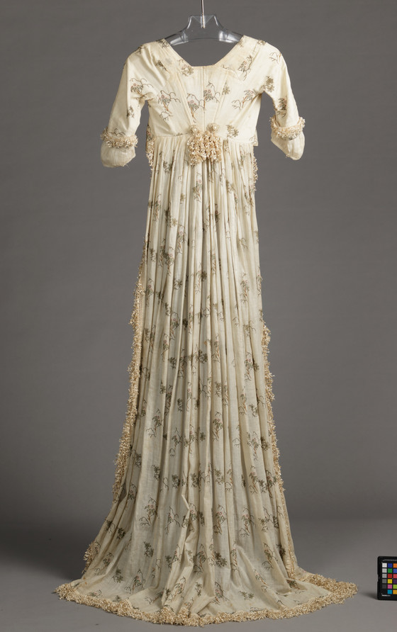 Dress: cotton plain weave (muslin), silk and metallic-thread embroidery, with silk fringe. Placket: cotton plain weave (muslin), silk and metallic-thread embroidery, with silk passementerie. Textile length: cotton plain weave (muslin)