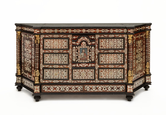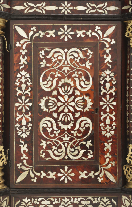Wood, inlaid with tortoiseshell, mother-of-pearl, and ivory; oil painting on tin; glass; brass; copper fittings; and iron hinges