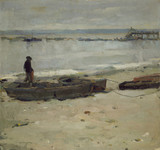 Armin Carl Hansen was among the foremost Northern Californian artists in the early twentieth century and was heralded as "the Winslow Homer of the West Coast." He was most often identified with powerful seascapes and genre scenes of fisherfolk. Inspired by the example of his father, the frontier painter H. W. Hansen (1854-1924), Armin Hansen began studying art in 1903 at the Mark Hopkins Institute of Art with Arthur Mathews (1860-1945), but the San Francisco earthquake of 1906 cut short his studies there. He continued his studies abroad with Carlos Grethe (1864-1913) at the Royal Academy in Stuttgart. Hansen maintained a studio at Nieuwpoort, a rustic art colony near Oostende, on the coast of Belgium, where he painted the life of fishermen. While working on a trawler in the North Sea, he became well versed in the sea’s moods. In 1910 he created his first works in etching, a medium in which he excelled.