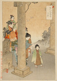 About 1880-1881 he took the surname Ogata claiming to be a descendant of the ceramist Ogata Kenzan ostensibly given that designation by the head priest of Toranomon Kotohira Shrine. (see Newland p. 5). From around 1880, Gekkō was designing prints and illustrating books and newspapers, again concentrating on current events. In 1885 Gekkō exhibited in the Painting Appreciation Society, and he became acquainted with the art scholars Ernest Fenellosa and Okakura Kakuzō. That year also he was listed in "The Guidebook of Tokyo Fashion" as #7 out of 23 print artists, defining his career as that of a nishiki-e artist.