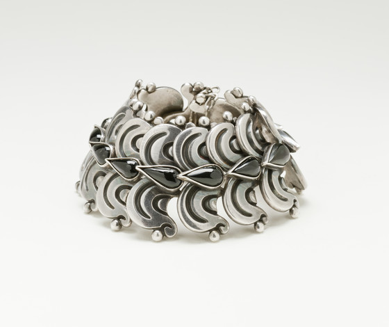 Silver Feathers and Obsidian Cabochons Bracelet (Pulsera con plumas de plata y cabujones de obsidiana)