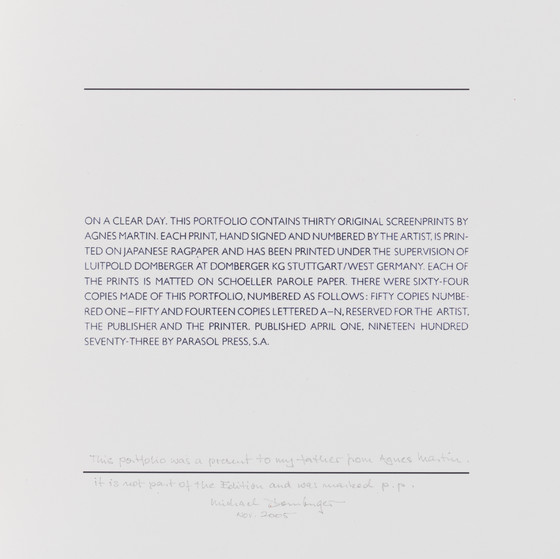 Agnes Martin's monumental thirty-print suite, On a Clear Day, was produced near the end of a seven-year period (1967–1974) in which the artist ceased painting entirely....