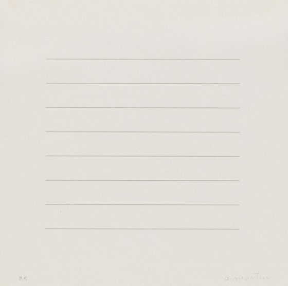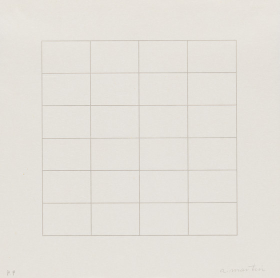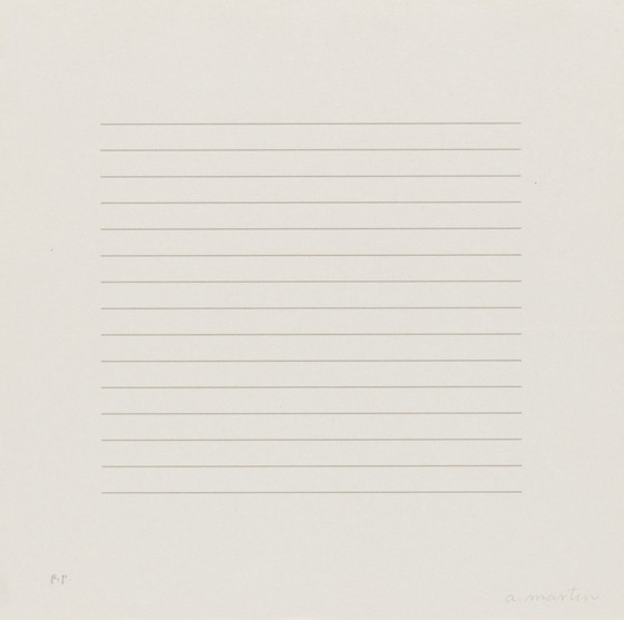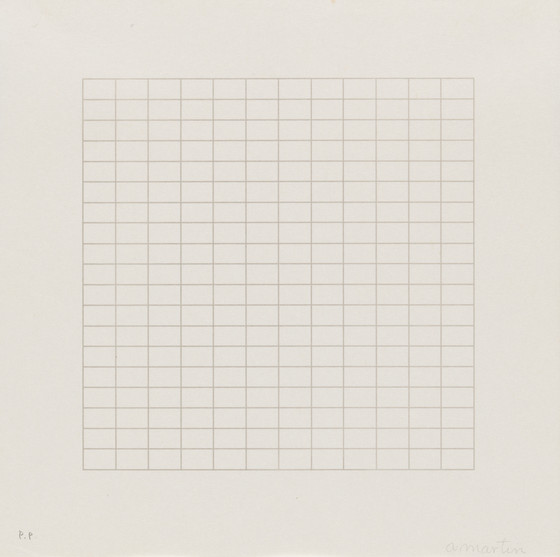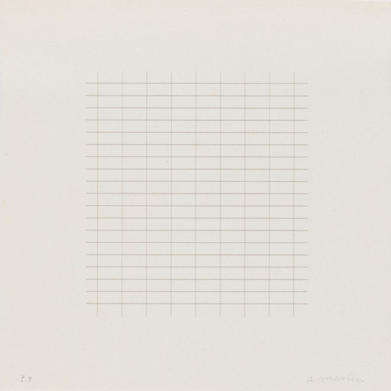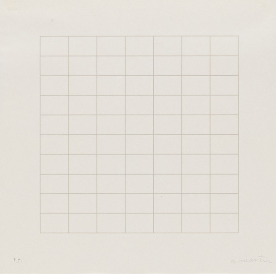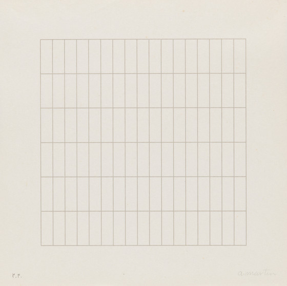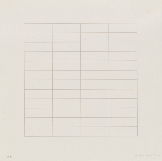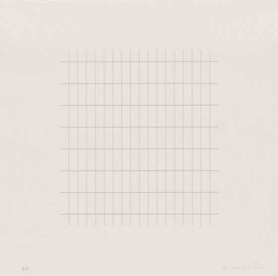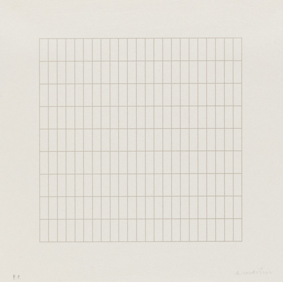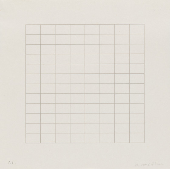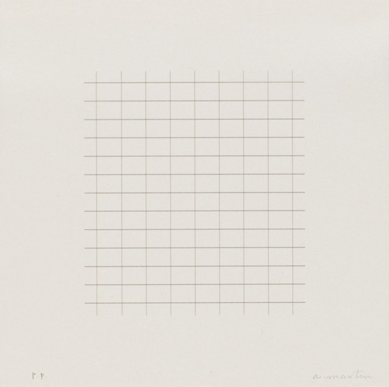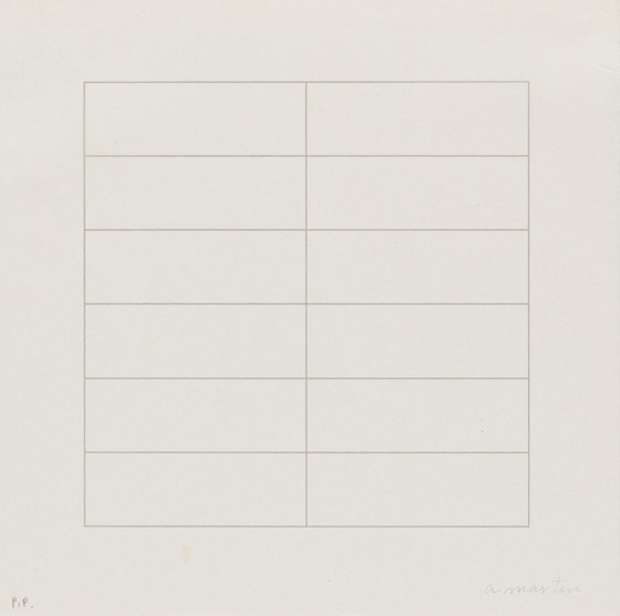 Agnes Martin's monumental thirty-print suite, On a Clear Day, was produced near the end of a seven-year period (1967–1974) in which the artist ceased painting entirely. Living in self-imposed isolation on a lonely mesa in New Mexico to which she had escaped after several years in New York, years in which she had achieved both fame and critical success, and fleeing what she saw as the burden of endless distractions, inescapable impediments to the necessary clearing of her mind to achieve her goal of an "egoless" art embodying beauty, freedom, and happiness, she sought refuge in near-total seclusion. This enforced period of artistic inactivity and contemplation, part of the artist's rigorous path toward finding truth in her art, was finally broken in 1971, when Martin was invited to make the prints that would become, two years later, On a Clear Day. Indeed, shortly after completing the prints, she returned to painting, producing a steady stream of celebrated work until her death in 2004. As with all of her mature work, the prints of On a Clear Day take as their subject matter the grid, rendered with an astonishing diversity of expression, focused with severe rigor yet compositionally and interpretatively open. About her grids, Martin famously said, "My formats are square, but the grids never are absolutely square; they are rectangles . . . . When I cover the square surface with rectangles, it lightens the weight of the square, destroys its power." Elsewhere, she explained that the grid came to her as an inspiration. "I was thinking about innocence, and then I saw it in my mind—that grid . . . . So I painted it, and sure enough, it was innocent." Martin's grid of rectangles, as one critic noted, "eradicated the hierarchical balancing of parts. The effect was not only a surface in perfect equilibrium, but one that epitomized unity and wholeness." While her grid was early on interpreted as a purified analog of nature, Martin vigorously rejected this reading. "My work is anti-nature," she declared. "[It] is about emotion—not personal emotion [but] abstract emotion. It's about those subtle moments of happiness we all experience." She succinctly defined art as "the concrete representation of our most subtle feelings." Grander in conception than any of Martin's paintings, On a Clear Day condenses through multiplication thirty ways of constructing a grid, of expressing happiness, beauty, freedom, and the impossibility of, though yearning for, perfection. Its individual parts, recalling the number of days in a month, imply the passage of time. Its title declares the long-sought-for clarity the artist had struggled to find in the barren New Mexican desert. One of the great works of graphic art of the late twentieth century, On a Clear Day announces with luminous clarity and conviction Martin's return to aesthetic wholeness. LACMA's collection includes the painting Untitled V (1981) and the drawing Not the One (1966) by Martin, who is one of the most important figures of postwar American art. Kevin Salatino, Curator, Prints and Drawings, (2008)