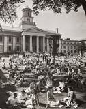 University of Iowa student enjoying a sunny autumn day on lawn in front of Old Capitol of their beautiful campus. Iowa City, IA, 1942