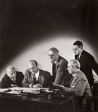 Meeting of Atomic Energy Commission: (L-R) Sumner Pike, Chairman David Lilienthal, William Waymack, Lewis Strauss and Robert Bacher. Washington, DC, 1946