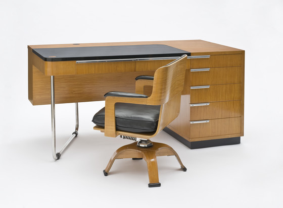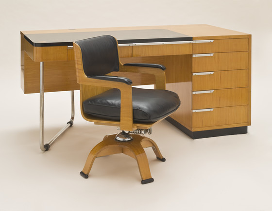 The desk, which has not been seen publically since the GGIE, is the embodiment of California modern, combining beautiful satinwood with the new materials of Bakelite and chrome plated steel. It was a custom design specially made for the room and shown at the GGIE with the equally innovative plywood chair. We don’t know if the chair was designed specifically for the GGIE since it also appears in a drawing for an office that was part of another critically important commission for Weber – the site plan, all buildings, and furnishings for Walt Disney Studios in Burbank, also completed around the same time, in 1938-1939. (Wendy Kaplan, Department Head and Curator of Decorative Arts and Design)