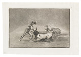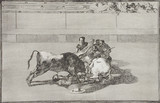 Un Caballero español mata un toro despues de haber perdido el caballero