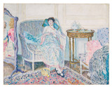 Frieseke began exhibiting internationally in 1901, was given a solo exhibition at the 1909 Venice Biennale, and had his first extensive showing in the United States at the Macbeth Gallery in New York in 1912. In 1920 he bought a summer house in Le Mesnil-sur-Blangy in Normandy, and around this time his style changed: his figures, always solidly rendered, became even more so as his fascination with decorative patterns diminished. Frieseke’s palette also became more somber, and his brushstrokes softened as he enveloped his figures in a quiet atmosphere. Frieseke remained in France for his entire career, continuing to find his wife and daughter his favorite subjects to paint.