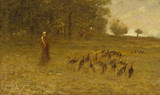 With the death of his father in 1859 Fuller was forced to renounce his career to manage the family farm. Before returning to Deerfield, he made his only trip to Europe, visiting galleries in England and on the Continent, where he admired Venetian painting as well as the art of Edouard Frère (1819-1886), Jean-Franqois Millet (1814-1875), and Jean-Baptiste-Camille Corot (1796-1875). Although he exhibited infrequently during the next fifteen years, he continued to paint during his leisure time. Financial problems with the farm prompted him to exhibit his paintings in 1876 at the Doll and Richards gallery in Boston. His paintings of fanciful female figures, blacks, and rustic genre scenes revealed a looser, more atmospheric style as well as liberal use of glazing and varnishing. This exhibition marked his full-time return to art and the beginning of a notable career as the farmer who painted in an advanced, yet spiritual style. He began to exhibit regularly in Boston and New York, and by 1880 the Society of American Artists accorded him the honor of being unanimously elected to full membership (he had been an associate member of the National Academy since 1857).