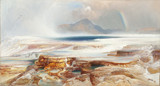 Known as "the American Turner," Thomas Moran, Jr., gained fame for his sublime landscapes of the Yellowstone and the Grand Canyon; he was equally famous for his watercolor and oil paintings. Born into a family of artists, Moran began his career around 1856 in Philadelphia as an etcher and in 1858 exhibited his first important painting at the Pennsylvania Academy of the Fine Arts. In 1861 he traveled with his brother Edward (1829-1901) to England expressly to study the paintings of J. M.W. Turner (1775-1851). Moran also traveled throughout England and Scotland, perfecting his use of the English sketching technique.