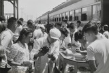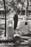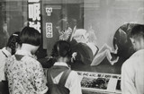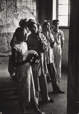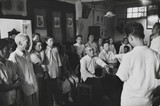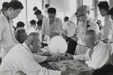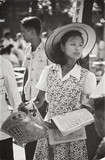 China (Young woman with fan and soldiers visiting an exhibition of paintings at the cultural department of the People's Army...)