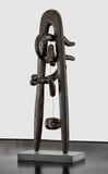 Isamu Noguchi was one of the most significant sculptors to emerge in the period between the two world wars. The son of a Japanese poet and an American writer, Noguchi spent most of his early years in Japan. After returning to the United States in 1918, he was apprenticed briefly to the sculptor Gutzon Borglum (1867-1941) and then studied with Onorio Ruotolo (1888-1966) at the Leonardo da Vinci School of Art in New York. A Guggenheim Fellowship enabled Noguchi to travel in 1927 to Paris, where he served as a studio apprentice to Constantin Brancusi (18761957). In the early 1930s he visited Paris; Peking, where he studied brush drawing with Qi Baishi (1863-1957); and Japan, where he learned ceramics from Uno Jinmatsu. In the mid-1940s he began creating marble slab constructions, using abstracted biomorphic shapes, and associating his sculptures with myths. He also continued to sculpt in terracotta and ceramic. In the late 1950s he reintroduced into his art more angular, geometric shapes, and he also worked in metal, particularly aluminum.