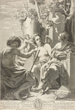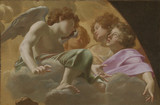 Considered one of the most influential French artists of his generation, Simon Vouet was born in Paris but divided his career between Rome and his native city. His initial training came from his father, a minor artist. By the age of fourteen, the younger Vouet had visited England; he later traveled to Constantinople and Venice before settling in Rome in 1614. He remained in Rome until 1627, supported by a pension from Louis XIII and patronage from the powerful Barberini family, as well as other aristocratic and ecclesiastical patrons in Rome, Genoa, and Naples. His early reputation was as a portrait painter. The influence of Caravaggio’s naturalism and tenebrism—a style of painting that engulfs most figures in shadow while dramatically illuminating others is evident in Vouet’s portraits and major religious commissions. Vouet was elected president of the Academy of Saint Luke in 1624 and played an integral part in the development of the Roman school and the articulation of the Baroque style. A skilled draftsman, Vouet’s assimilation of the classicism of Annibale Carracci and Guido Reni and the illusionism of Lanfranco is evident in his decoration of the vault of San Lorenzo in Lucina, as well as in his fresco altarpiece for Saint Peter’s Basilica, for which Two “Modelli” for Two Groups of Angels was painted. Toward the end of his residence in Rome, Vouet painted Virginia da Vezzo, the Artist’s Wife, as the Magdalen (LACMA).