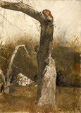Andrew Wyeth is one of the most popular twentieth-century American painters. The son of painter and illustrator N. C. Wyeth (1882-1945), Andrew grew up in an environment devoted to art. His father was his only teacher. With his first solo exhibition at the Macbeth Gallery, New York, in 1937 he established his preference for subject matter derived from his own surroundings. During the first fifteen years of his career he had frequent exhibitions at the Macbeth Gallery and at Doll and Richards, Boston, and in 1962 was accorded the first of several major museum retrospectives at the Albright-Knox Art Gallery, Buffalo.