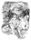 The man raises his head from the grave, on which the woman sits