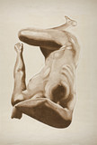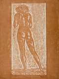 Also around this time, Shinagawa designed an unusual print called Umibe no gensô (Fantasy of the sea: 海べ幻想) from 1948. Fairly large in size (419 x 356 mm), it portrays a classically modeled head in the Western manner, perhaps meant to be Poseidon (Neptune), or at least a sea-god. (Given the model used by Shinagawa for his Stone Buddha the year before, and the fact that he was also a sculptor, it seems likely that Shinagawa also used a plaster-cast statue in his studio as a model for the sea god.) The monochromatic display of drawing, carving, and printing skills makes for a potent image.