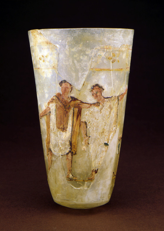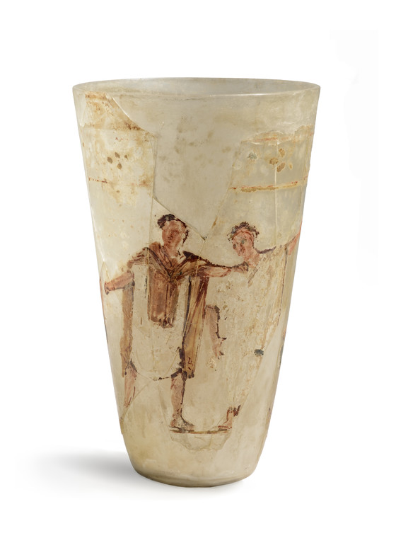 The technique of glass-blowing was developed in the late first century B.C., and radically transformed the glass industry, making production quicker and easier, and glassware more readily available. Glassworkers employed numerous techniques to decorate their vessels - tooling whilst they were hot, engraving or carving when cold. Rarely preserved are examples of painted glass. This beaker is therefore particularly valuable, and was doubtless a luxury vessel the rim preserves traces of gilding - made for a cultured and high-class elite. It would be remarkable for its good state of preservation alone, but the enigmatic scene and fragmentary inscription render it the most fascinating vessel within LACMAs significant collection of ancient glass.
