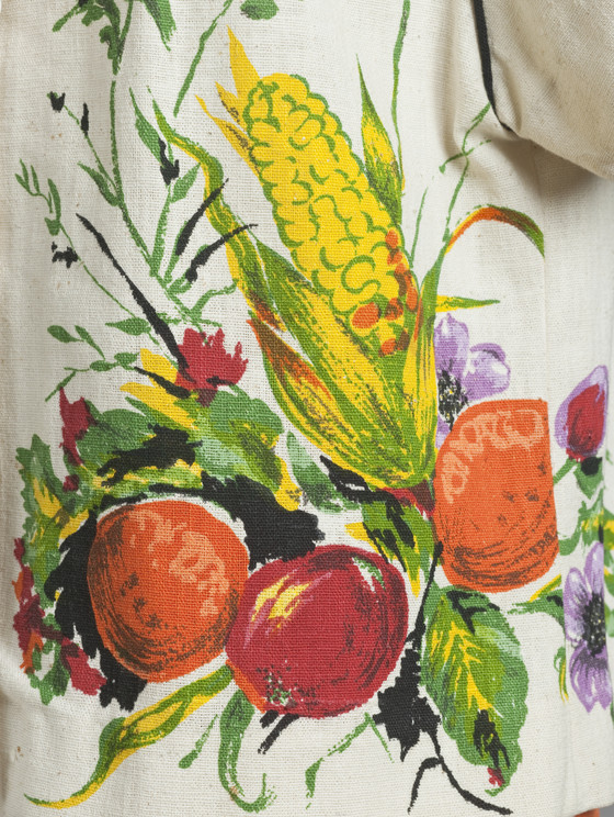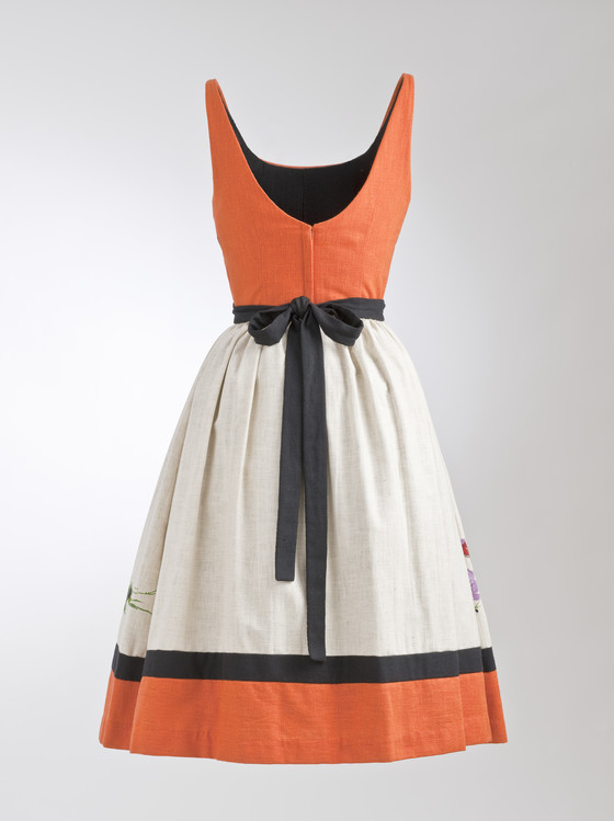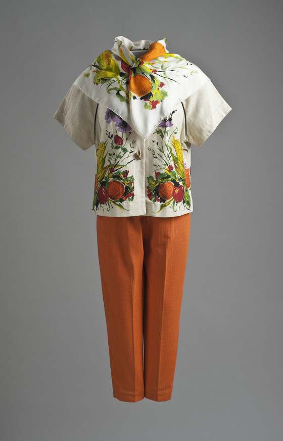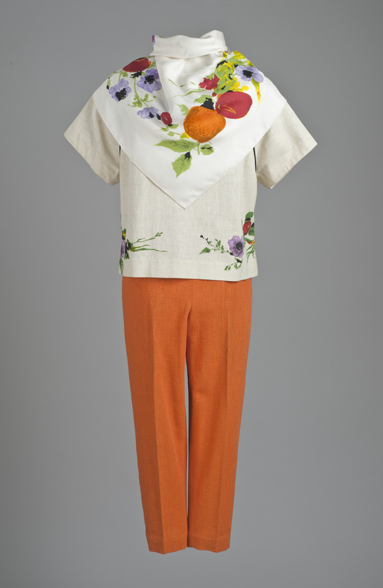 a) Dress: Linen plain weave, printed, linen plain weave; b) Blouse: Linen plain weave, printed, with linen plain weave trim, and bamboo buttons; c) Pants: Linen plain weave; d) Scarf: Silk twill, printed.