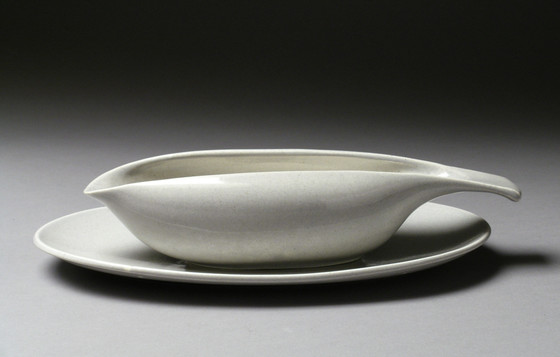 a) Gravy Boat: 2 3/4 x 10 1/4 x 3 5/8 in. (7.0 x 26.0 x 9.2 cm); b) Plate: 1/8 x 10 3/4 x 6 1/8 in. (0.3 cm) x 27.3 x 15.5 cm)
