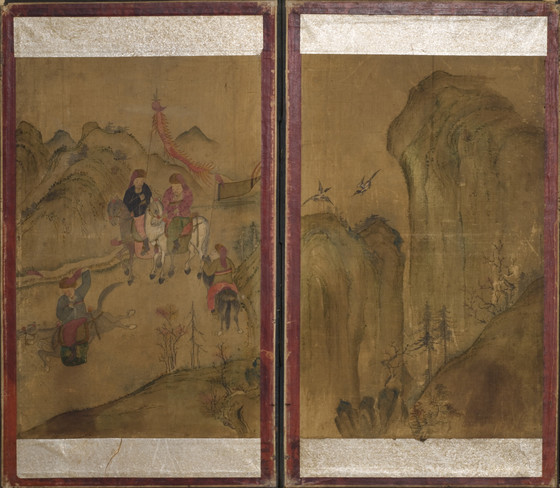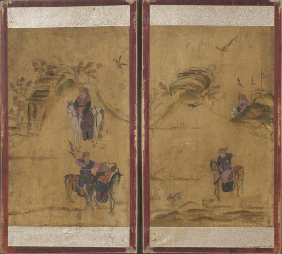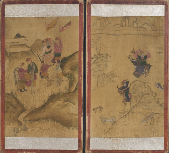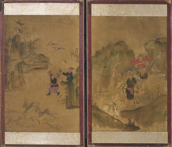 The other side of the screen features a painting of Mongolian hunters in a rugged mountain landscape. In contrast to the didactic function of the eight virtues set, hunting scenes signified power and courage and were a popular subject for display in the quarters of military men. Such subjects were also believed to ward off evil fortune, a parallel to the vigorous hunters as they chase their prey.