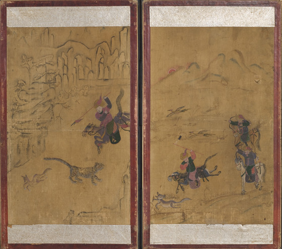 Mounted on each side of this screen are unrelated paintings: on one side is a set of the eight Confucian virtues, and on the other a Mongolian hunting scene. Works with these themes are generally considered folk paintings, or minhua, because they were favored by the public and mass-produced by unknown local artists. Screens had the practical functions of dividing space and blocking wind and sunlight, and folk screens such as this were extremely popular because many of their subjects were intended to evoke good fortune and success or to teach proper values. Both paintings capture the charm and beauty of Korean folk paintings, which are characterized by abstract form, a sometimes-crude technique, and subtle humor.