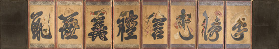 Although there are many known screens illustrating the eight virtues, LACMA’s example is distinctive because each panel also includes four lines from proverbs related to each virtue. The artist arranged the characters and their visual elements with great harmony, embedding the images with two different techniques: in some characters, the images completely replace a character stroke, while in others, the pictorial elements appear inside an existing stroke. In earlier screens, the related images were usually embedded within the character stroke, as seen in this example from the Leeum, Samsung Museum of Art (fig. 1). Because the LACMA screen combines the two styles, it can be dated to the nineteenth century.