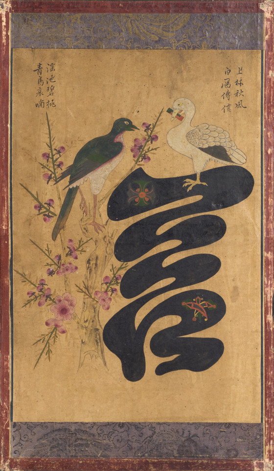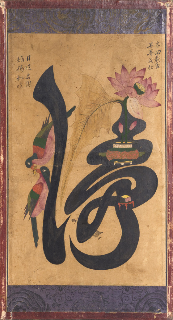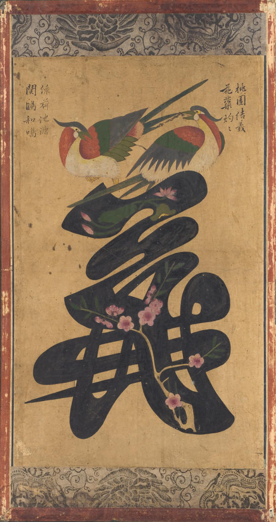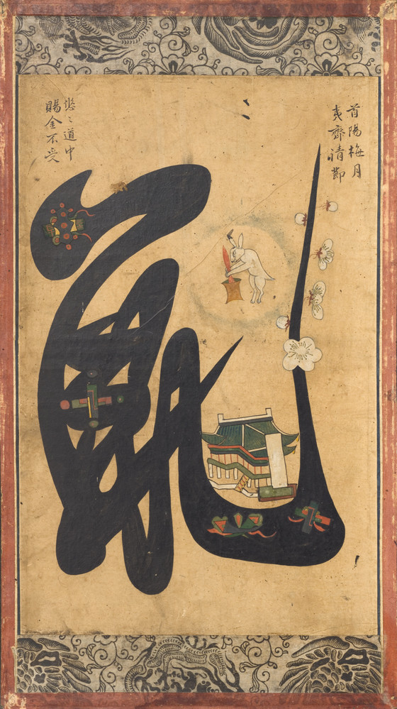 In pictorial ideographs, called Munjado, calligraphic paintings of Chinese characters are integrated with images that relate to the characters’ meaning. Sets featuring the eight Confucian virtues were popular, which demonstrates the importance of Confucian ideas and practices during the late Joseon period. Always appearing in the same order, the eight Confucian virtues are, from right to left, filial piety, brotherly love, loyalty, trust, propriety, righteousness, integrity, and sensibility. Often displayed in a child’s room, the images were didactic and intended to inspire proper values.