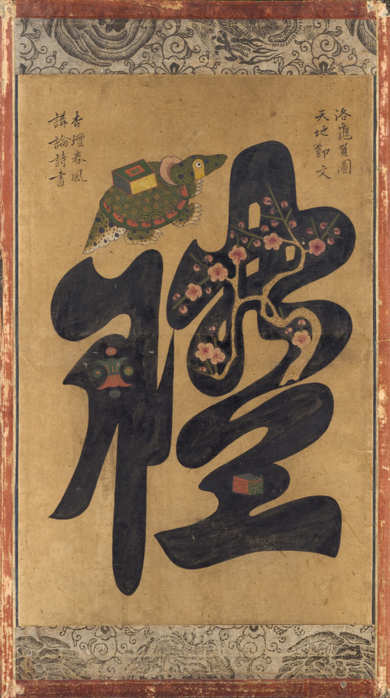 The first character (hyo; 孝) represents filial piety, which was the highest virtue in East Asian culture (det. 1). Each of its several pictorial symbols suggests a different story of filial piety, which are also recorded in the inscription. A zither inserted in the horizontal stroke relates to the story of the ancient mythical Chinese king Shun. Before ascending the throne, Shun always obeyed his blind father and abusive stepfamily. Because of his good character, King Yao chose Shun as his heir. When King Yao married two of his daughters to King Shun, he also gave him a five-string zither as a present.[1] The fish on top of the character symbolizes the story of Wang Xiang, who, by lying on the ice of a frozen river, caught fresh carp in winter to give to his unkind stepmother, thus earning her respect.[2] The bamboo shoot represents Meng Zong, who cried in a winter bamboo grove because he could not find a bamboo shoot to feed his ailing, elderly mother, causing a bamboo shoot to sprout.[3] Finally, a fan resembling a lotus flower suggests the legend of Huang Xiang, who fanned his father’s pillow and bed in summer and warmed them with his body heat in winter.[4]