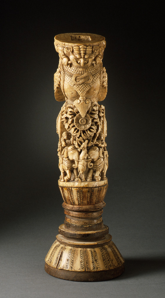 Orissan ivory throne legs are often fashioned in the form of a rampant animal that is stylistically derived from earlier architectural and sculptural conventions. Most common is a mythical leonine creature (yāli or vyāla) or, occasionally, a hybrid elephant-lion (gajasimha). The representations of both fantastical beasts are idiosyncratic in that the animals’ heads are rotated 90° and portrayed in the impossible posture of facing completely backwards in relation to the rest of its body. Orissan ivory yālis have a stylized mane that drapes over their back and arms like a cape, fan-shaped ears pointing upward, three or four rows of bushy eyebrows, a thick and multifaceted moustache, almond-shaped eyes, a long pointed nose with prominent nostrils, and a tongue that protrudes to the point of touching its shoulders. Their bejeweled bodies have the tail of an elephant, short and stubby. In front of the exposed underside of the yālis is normally a lotus blossom, birds, and/or foliate filigree. At the base are various figures and riders on horses and elephants in procession. Frequently depicted at the top opposite the yāli heads is a crouched figure with a leonine head and human arms with hands grasping bejeweled garlands. It represents a "Face of Glory" (kīrttimukha).