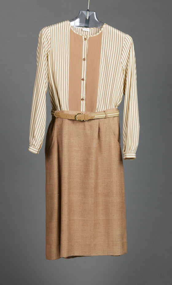 Jacket: silk plain weave; Skirt: silk plain weave; Blouse: silk plain weave with metallic trim; Belt: leather and metal