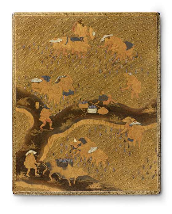 Lacquer with maki-e (sprinkled powder design) and mother-of-pearl inlay over wood core