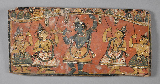 Manuscript Cover with Krishna Raising Mt. Govardhan (inside) and the Coronation of Rama (outside)