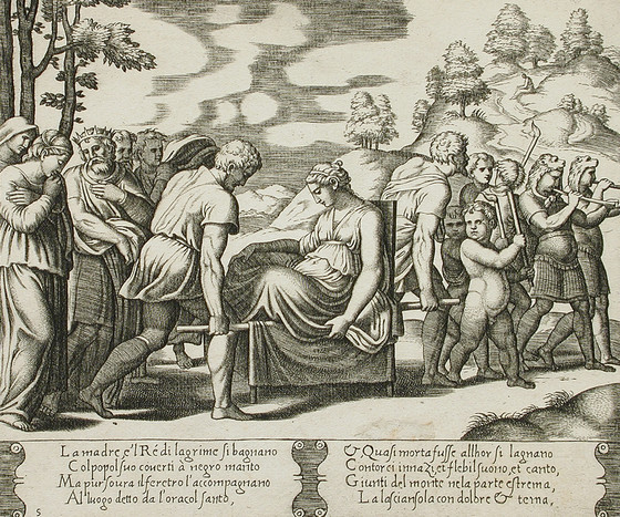 Psyche carried on a litter being taken to a mountain
