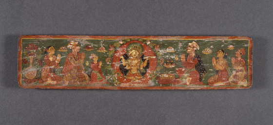 Opaque watercolor and ink on paper and wood; wood cover wrapped with thread and colored with ointments