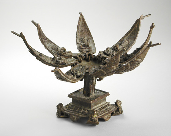 This is a three-dimensional copper sculpture of a lotus blossom on a stem rising out of a square water tank (kunda), which is supported by a lotus base with a guardian lion at each of the four corners and decorated with carpet swags draped over the sides.